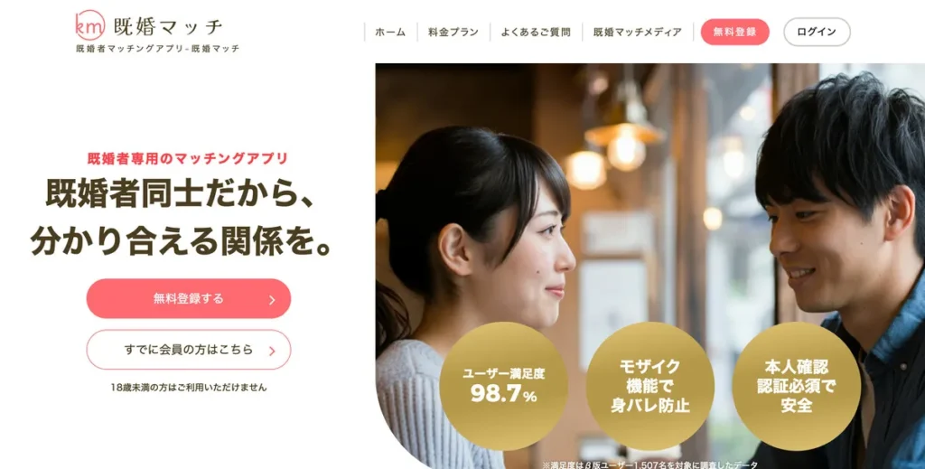 既婚マッチは身バレ機能が充実した既婚者マッチングアプリで、ニックネームでの登録や顔写真のぼかし機能などが搭載されています。また、本人確認金融機関でも使われるeKYCシステムの導入で、サクラや業者などの悪徳利用者が排除されて安心です。