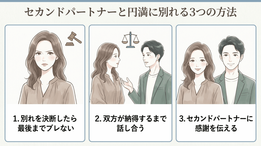 円満な別れ方のポイントについては、「セカンドパートナーと円満に別れる3つの方法」で詳しく解説します。