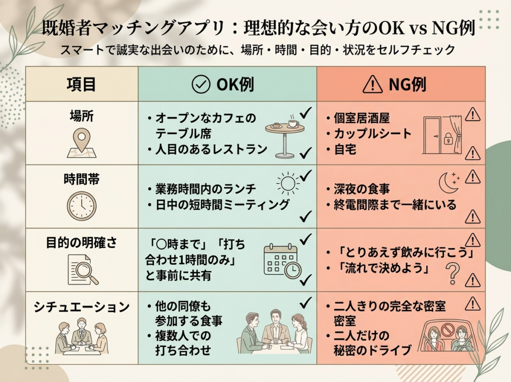 会う際は「場所・時間帯・目的・人数・終了時間」を事前に設定することが大切です。以下の基準を意識するだけで、不要な誤解やリスクは大きく減らせるでしょう。